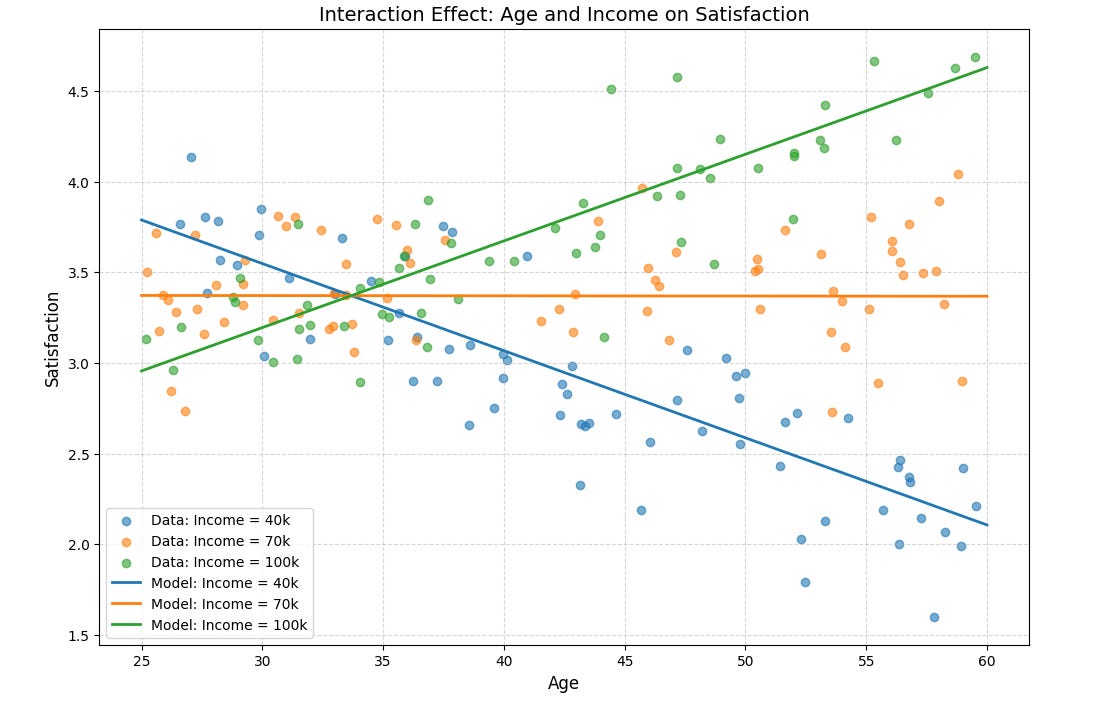 Interaction effects allow us to study whether the effect of one variable (e.g., income) on the dependent variable (e.g., satisfaction) changes depending on the value of another variable (e.g., age). This is particularly useful in understanding complex relationships, such as: