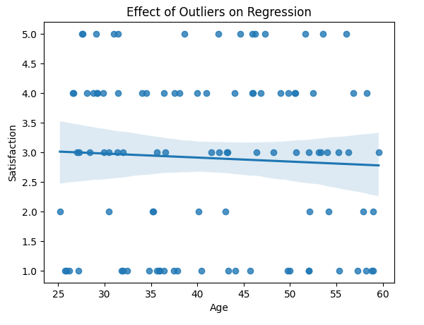 Linear regression is highly sensitive to outliers, and this can be particularly problematic when applied to Likert scale data, which has a limited number of response options. Outliers—responses that deviate significantly from the norm—can disproportionately influence the model, distorting regression coefficients and leading to misleading or inaccurate conclusions. This sensitivity can undermine the reliability of the model, especially when the Likert scale is treated as continuous, as the outliers may not reflect true variations in the underlying data. Here is an example visualization of how a linear regression can lead to misleading results: