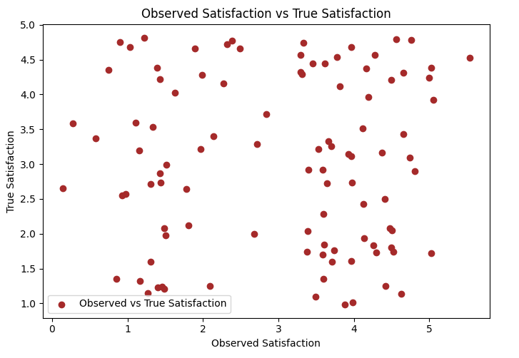 A scatter plot comparing these two perspectives clearly shows the gap between linear assumptions and the true ordinal nature of the data. The pattern in true satisfaction is not linear, emphasizing the risk of assuming equal intervals and the potential bias in coefficient estimates from linear regression.